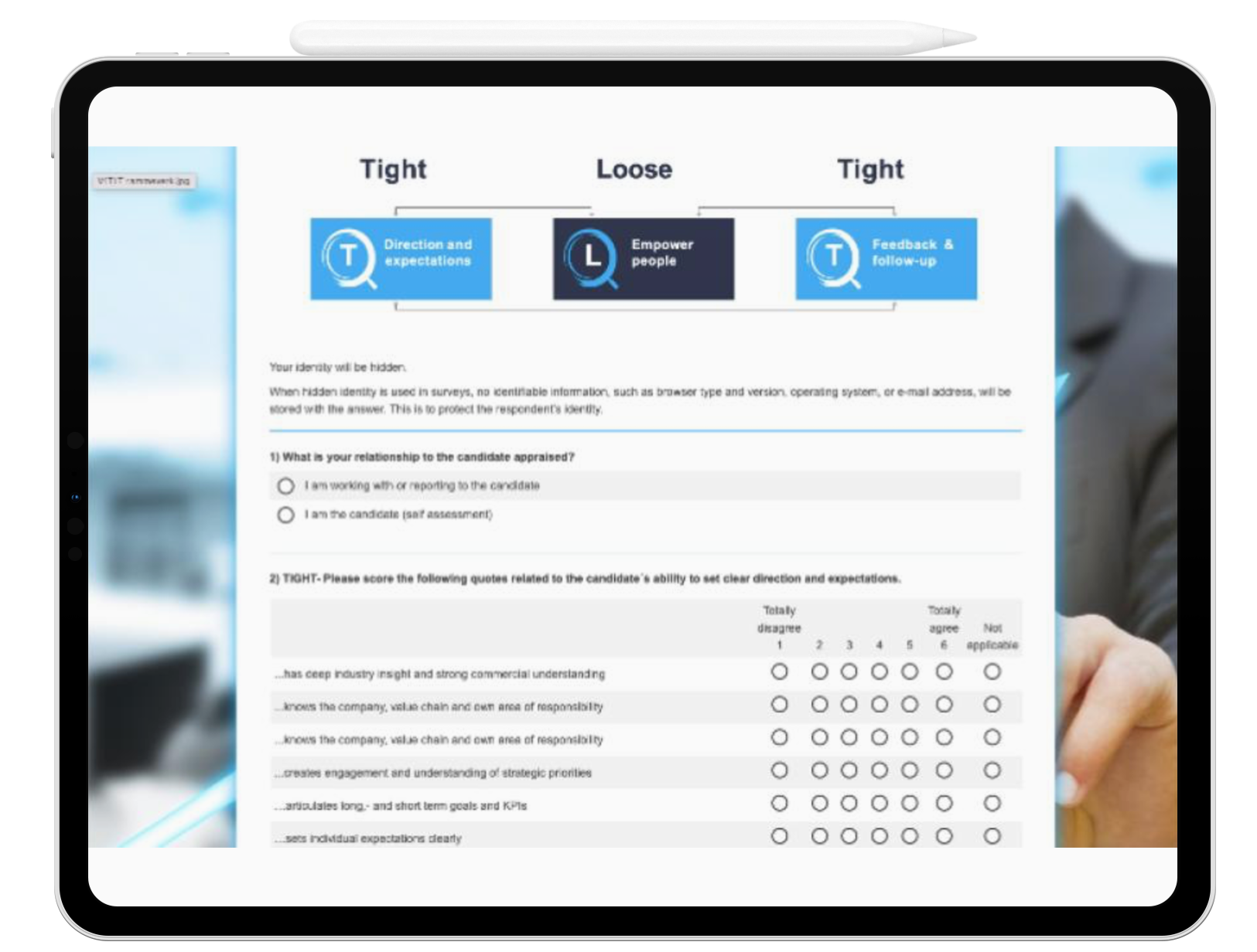 The candidate receives a TLT- feedbackprofile as well as a complete TLT- analysis based on both self assessment and input from his/her team.